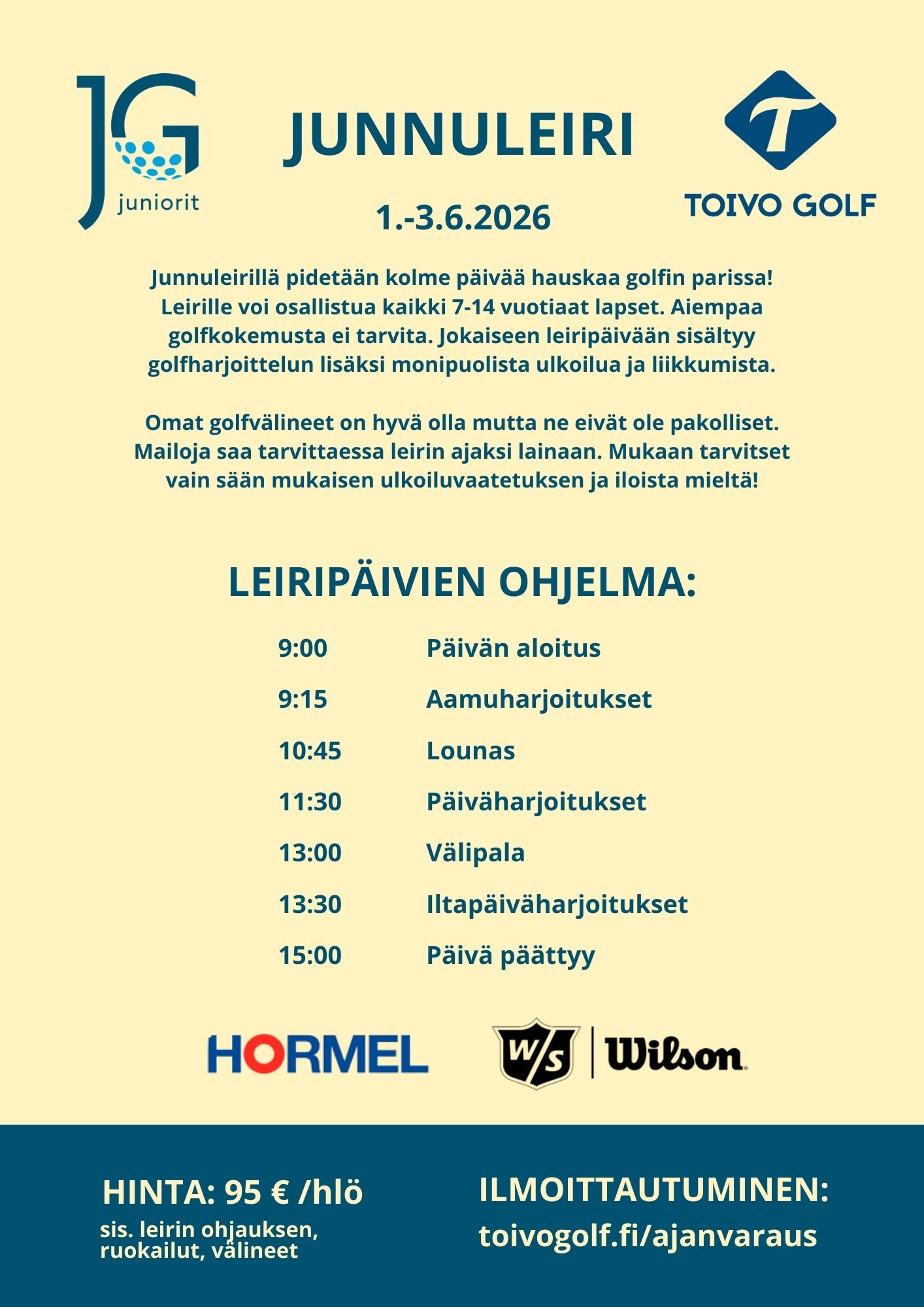 Leirien ilmoittautuminen: toivogolf.fi/ajanvaraus